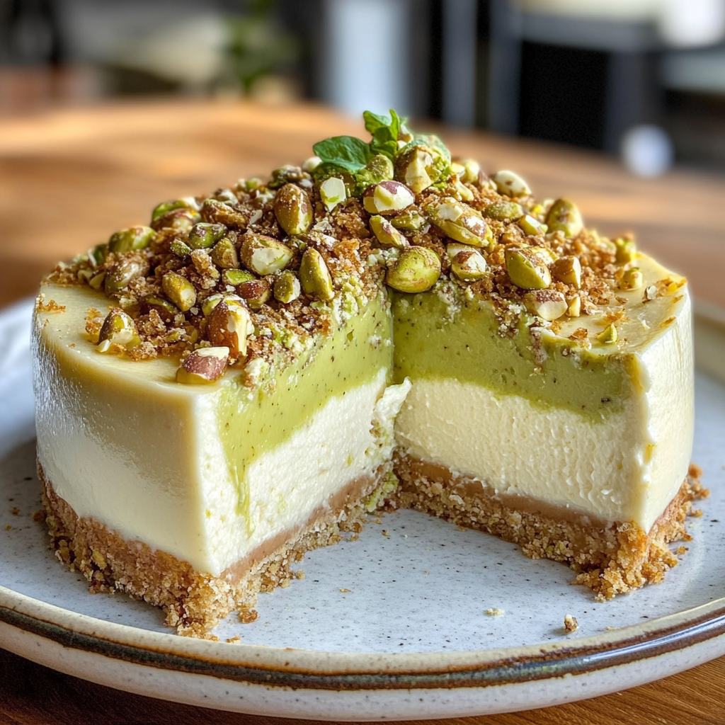 Indulge in the rich, creamy delight of Moist Pistachio Cheesecake with Topping. This decadent dessert marries the nutty flavor of pistachios with a velvety cheesecake filling, topped with fluffy whipped cream and crunchy pistachios for an irresistible finish. Perfect for celebrations or a sweet treat after dinner, this cheesecake is sure to impress your family and friends!
