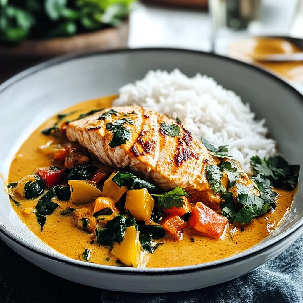 This coconut salmon curry can be served over fluffy jasmine rice or quinoa for an extra nutritional boost. For an elegant touch, serve it in shallow bowls garnished with fresh cilantro leaves and lime wedges on the side. Consider pairing it with naan bread or crispy papadam for added texture! A sprinkle of toasted sesame seeds can also enhance presentation while adding crunchiness.